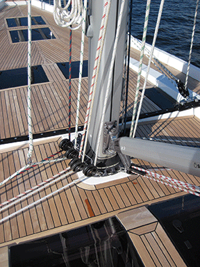 Hanse575maststephalyardsWe put the Volvo 110-hp. diesel through its paces as we motored out into the bay. At cruising revs of 2200 rpms, the 575 maintained an easy 7.5 knots and did so very quietly. The engine room is well insulated so at that speed you barely hear the engine and feel no vibration underfoot. At maximum revs, the 575 plowed along at nearly 9 knots on the flat water inside the bay. The 575 carries 138 gallons of diesel. At a conservative 1800 rpms, the engine will burn about a gallon an hour and generate 6.5 knots of boat speed. That translates into an 845-mile cruising range, which is a good safety margin when passagemaking.