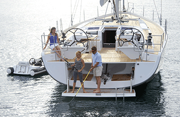 The bow has a small sprit that doubles as an anchor roller and a teak step for those times when you are Med-moored with the bow to the quay. The 575’s stern folds down to create a huge platform and in the process exposes the dinghy garage that is neatly tucked under the cockpit. The garage was designed specifically for a Williams jet drive RIB but other RIBs can fit inside as well.