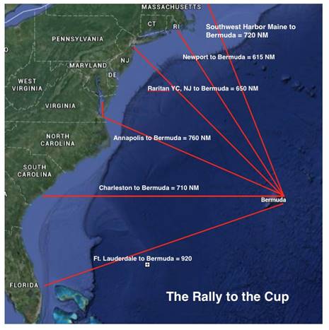 The Rally to the Cup departs from six different ports, each of which have a host committed to welcoming participants. They are: Southwest Harbor, Maine/Hinckley Yacht Services; New York Harbor/Raritan Yacht Club (New Jersey); Newport, R.I./ Offshore Passage Opportunities; Annapolis, Md./National Sailing Hall of Fame; and Charleston S.C., Ocean Sailing Academy; West Palm Beach, Palm Beach Sailing Club.