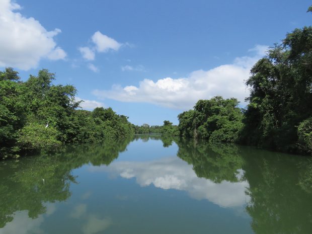 Just around five miles in we rounded a tight corner, the space around us opened into a wide savanna-like flatlands. At first there were small rudimentary corn fields tucked in here and there and then large cultivated fields. We had read of a Mayan village about five miles in. On the left side up on the rise up from the river, the thatched roof, weathered wood slatted house began to appear. Colorful laundry, chickens and dogs, and the beautiful hand carved cayucos pulled up on the bank were evident. A bit further up river more Mayan houses. These had vine covered thatch roofs that could be seen through the dense vegetation with the look of a deserted village (and might well be). We then motored around another curve to find beautiful healthy cattle grazing. Brown and white, they were accompanied by white cow birds, Cattle Egrets, that hung with the cattle as the cattle pulled and chewed the grasses leaving bugs that the birds enjoyed. As bucolic and lovely the cattle on the shore seemed, the contrast of the village and what seemed to be a thriving cattle farm represent the difficulties of a disenfranchised population.
