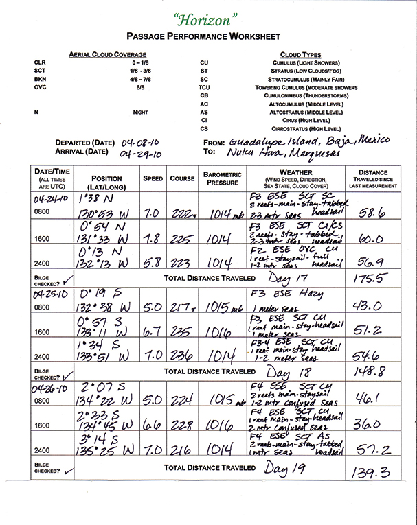 All of this led to the development of a passage performance worksheet, upon which we are able to record relevant information for several days on one sheet. This material is later transferred into our daily ship’s log for a permanent record.