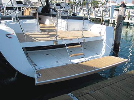We folded up the huge swim platform aft and then backed out of the slip. The big boat backed easily and turned sharply in reverse. The bow thruster helped us maneuver the bow in tight spaces and to make the turn departing the marina. Once underway, the 60 powered at eight knots at cruising revs and maxed out at 9.8 knots at full revs.