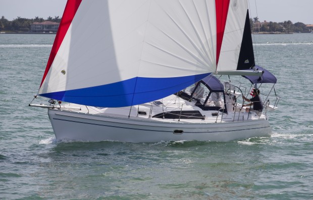 Even though the boat is a small cruiser and all her gear and rigging are light, the 315 has been equipped with both a roller furling genoa and an in-mast roller furling mainsail. Sailing her is a snap. Once we cleared the William Powell Bridge to Key Biscayne, we rolled out the main and then set the genoa.