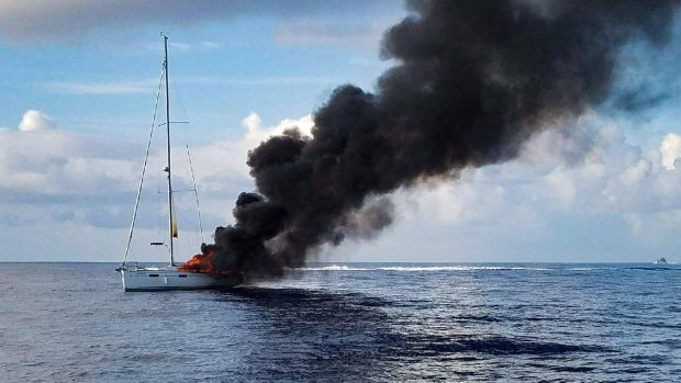 A mariner was rescued after his sailboat caught fire in the Atlantic Ocean while off the coast of Broward County, Florida.