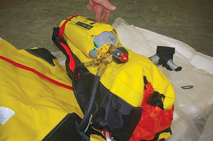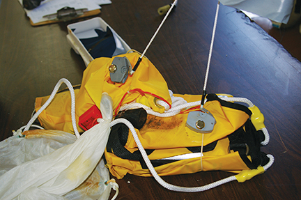 When we opened up the MOM8-A’s hard case it was quickly apparent that both CO2 canisters were corroded well past their prime. Rollie then used an air compressor to fill the pylon and horseshoe to check for leaks and any chaffing. As with the life raft, he gave me a part-by-part explanation and showed me how the horseshoe should be worn and used to lift a person out of the water.