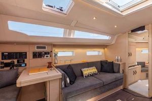 The boat is set up for a couple who can manage all sailing trim chores from the cockpit and, with the electric sheet winches, they can run the boat easily and efficiently. The 51 is a Philippe Briand design and the pedigree he brings to the hull shape and underwater foils can be seen in how well the boat sails. This may be an ideal size for couples who want to cruise in comfort but also want to sail a boat that does it all very well.