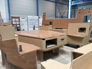 Standard workflow, like plumbing, electrical and furniture installation, is an often repeated process that minimizes errors even as different workers become involved on different days. Boats are built from the hull up so everything, including the engines, systems, bulkheads and furniture, is installed before the deck goes on like a lid. In each plant, the tooling is mobile so workstations can be dis-assembled, moved or changed up on the fly and that keeps things flexible in the event that sales orders change.