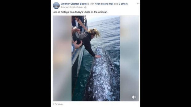 A video posted to Facebook by a Fort Bragg, Calif., whale-watching company shows passengers leaning over the side of a boat to pet a passing gray whale in a once-in-a-lifetime experience. Another shows the whale blasting a man with water from its spout as other passengers laugh.