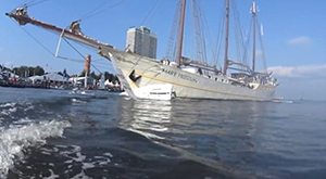 A dinghy sailor had to abandon ship to avoid being run over by a tall ship in Germany. Story by the Daily Mail