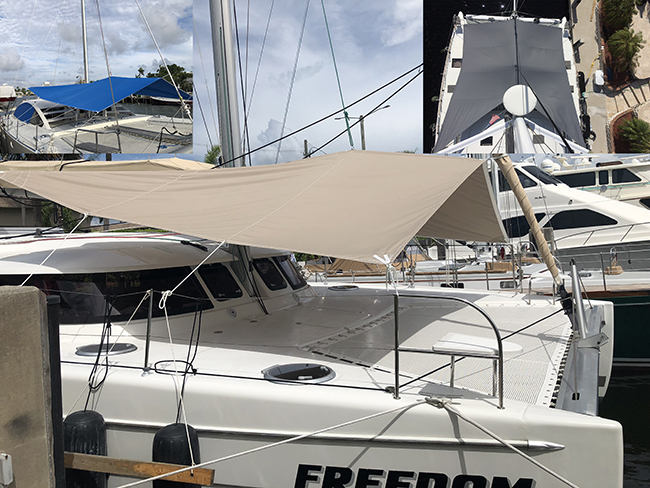 | Stretched between the cap shrouds, mast and headstay and hoisted with the spinnaker halyard, the ATN Multi Awning covers all of the forward deck, cooling the whole boat at the anchorage and allowing lounging on the trampoline. You’ll be able to keep the forward hatches open even with rain. It’s low forward windage and robust construction will allow leaving it up with tradewind force winds while at anchor. Read More |