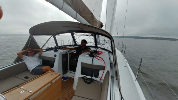 The Hylas 48 on the other hand is a classic Bill Dixon displacement cruiser with a full body hull, a large 135% headsail and an in-mast mainsail. At 40,000 pounds it is heavy and moves through the water deliberately. The center cockpit is snug and suited to ocean sailing. The interior is traditional highly varnished teak with huge double cabins fore and aft. The atmosphere is warm but dark and reminds me of the classics built by earlier Hylas yachts and other boats built in the Far East. The 48 sailed well in the mild breeze and seemed to make her own wind with the angle well forward of the beam. Her motion was slow and comfortable. With everything you could want on board, the 48 will cost you in the neighborhood of $850,000.