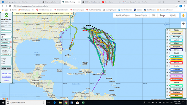 The Salty Dawg Fall Rally is in full swing as over 70 boats make passages south to the BVI, Antigua and the Bahamas. The fleet started from Hampton, VA in early November after a week of festivities and seminars at the Bluewater Marina. The rally has a free-form start in which skippers make their own decisions, based largely on the forecasts provided by Chris Parker, on when to leave. A lot of boats left on the 5th and 6th of November and many made their ways south to Beaufort to wait for a good window. The weather on the 7th and 8th was rough in the Gulf Stream but everyone got through okay. The boats headed to the BVI or Antigua were held up in mid-passage by a trough in the northern Caribbean that looked like it might become a tropical storm. It didn’t develop and the fleet was able to carry on. The tracking chart above, supplied by rally sponsor Ocens, was as of noon on Wednesday. The fastest boats have made landfall in the Bahamas and the BVI, while the lead boats heading to Antigua are still at sea. The whole fleet will be in by this time next week and the parties will begin. The Salty Dawg Sailing Association is an all-volunteer Rhode Island registered non-profit organization that offers rallies, seminars, rendezvous for cruisers and a crew list. Membership is open to all and is growing rapidly. Check out the website at www.saltydawgsailing.org.