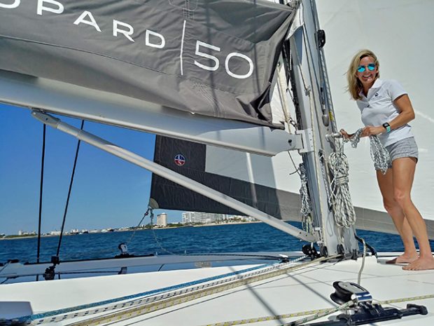 | I had the good fortune to spend a “day at the office” sailing the new Lagoon 50P in the trade-wind-swept waters off Ft. Lauderdale on Tuesday. The sun was out and the temperature in the low 80s. It’s one of those jobs that someone’s got to do, right? Might as well be me. Aboard were Katie Baker, pictured above, who is Leopard’s marketing manager, and Calvin, who is a professional skipper and knows all thing Leopard and all things catamaran. The point of the day out sailing was to get a feel for the Performance equipped version of the Leopard 50. Unlike the Leopard 50L, the P does not have the raised lounging area mounted atop the hardtop Bimini over the cockpit. Instead, the P has a wide flat area which is useful for handling the main sail and sunning. Without the lounge up there, Leopard has lowered the height of the main boom, which adds sail area in the main and makes handling the main—hoisting, reefing and furling—much easier than on her sistership. It also lowers the weight and cost of the boat. Out there in the turquoise water close to the Gulf Stream, we put the 50P to the test and were not disappointed. In 13 knots of steady breeze, the boat sailed at 7.5 knots close to the wind and added a full knot and a half when cracked off to a broad reaching angle. The feel on the helm was positive and the boat was simple for me to tack by myself – no mean feat in a 50-footer with 25 feet of beam. I really was impressed by the 50L when it came out since it made great use of the Bimini top for an added lounging area that linked the helmsman to the rest of the crew while under way. But, it seems more of a coastal cruiser or charter boat than a couple’s cruising boat. How many lounging areas does a couple or family need when they already have three at deck level? By reducing weight aloft, windage and lowering the boom, Leopard creates a boat that looks, feels and handles like a proper offshore passagemaker. And I think there will be many experienced cruisers who will like the sleeker look of the 50P, too. Check out the website for more information here. |