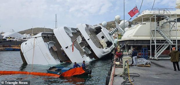 (The Daily Mail) – Not a good look. The Nourah of Riyad, a 230 foot luxury yacht was being lifted out of the water to have work done when the boat capsized, leaving it listing at a 45 degree angle. Read More