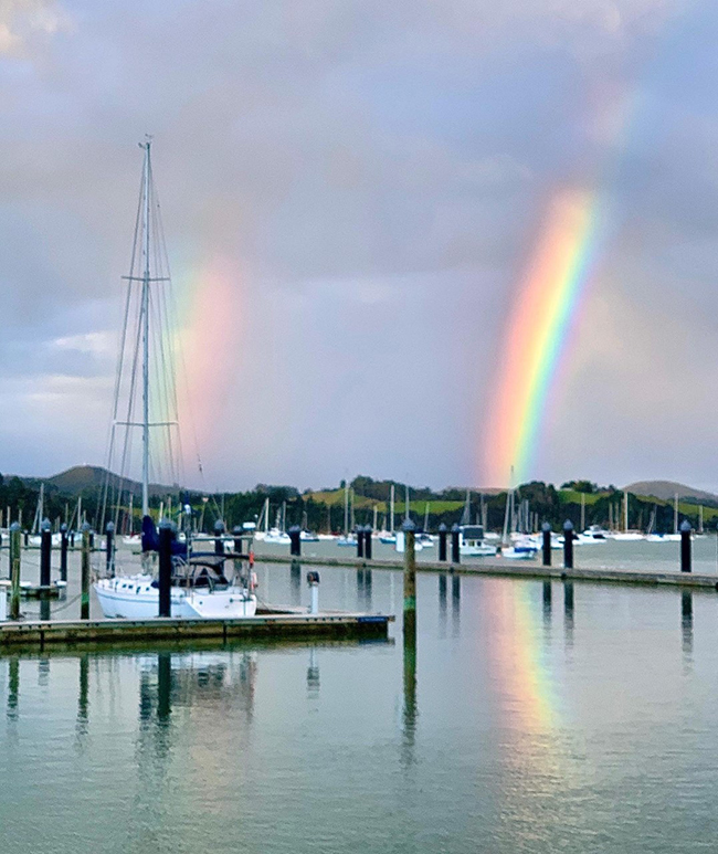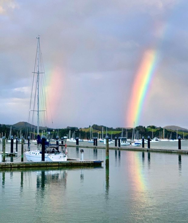 So here is a picture (above) of boats berthed and moored at Opua, Bay of Islands, with the Russell Peninsula in the background on the eve of the shutdown yesterday. It was taken from the deck of SV Wild Orchid, our Beneteau Oceanis 58 shelter-in-place home – two beautiful rainbows of hope and tranquillity! We are thankful for the hospitality of our Kiwi hosts.