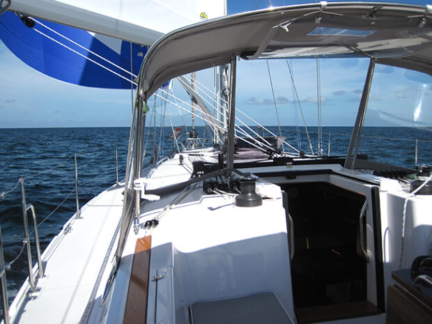 One of the aspects of most modern cruising boats is the simple fact that the cockpits are open to the weather. That means that we are obliged to retrofit some sort of cockpit protection system to keep us dry and out of the wind when sailing upwind or in poor weather or protect us from the sun in the fair weather. This usually translates into a dodger over the companionway and forward part of the cockpit, a Bimini top over the helm and an insert between the two that can be easily fitted and removed. These are made of fabric, such as Sunbrella, stainless steel tubing, hard fastenings and zippers. On some boats, particularly in cooler climates, owners add isinglass sides and backs for a complete enclosure. These retrofitted enclosures do their job but it does raise the simple question of why designers and builders don’t more often provide a more permanent solution to a problem every cruiser faces, protection from the weather. A few builders offer hard dodgers as an option and a few are providing inside steering stations in a raised saloon configuration. Catamarans often have an inside nav station where you can run the boat with a remote autopilot. But, in most cases we are beholden to somewhat flimsy canvas, tubes and zippers to protect us from the weather. I wonder if there isn’t a place in the sailboat market for cruising boats that come with a hard dodger and permanent helm protection?