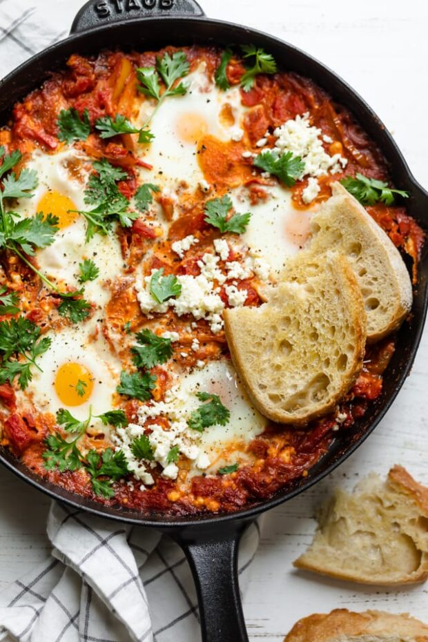 This shakshuka recipe from feelgoodfoodie.net adds feta cheese giving a great flavor to this traditional Mediterranean egg dish. A one-skillet meal, eggs are covered in a spiced tomato sauce which is made up of spices, onions and peppers. Great for breakfast or lunch. Read More