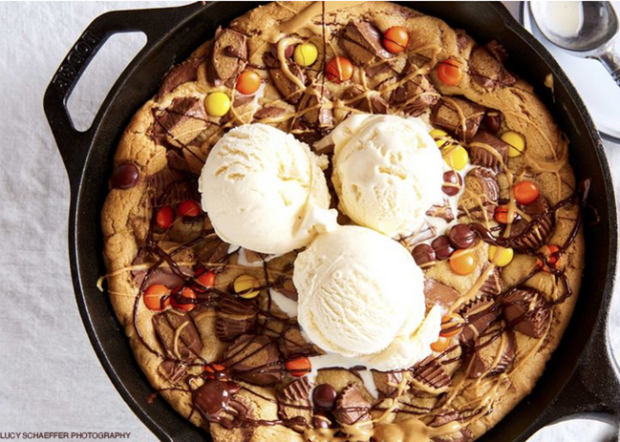 This may be considered a bit over the top, but what a way to go! If you’ve bought a few too many Reese’s Cups and Pieces in anticipation of Halloween, this recipe from Delish will help you use up some of the candy. You just can’t beat a warm cookie that includes peanut butter pieces topped with ice cream. Enjoy!