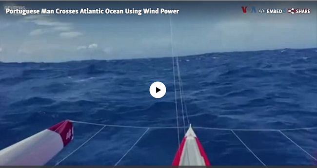 (learningenglish.voanews.com) – A Portuguese man has crossed the Atlantic in a small boat powered only by the sun and wind. He used kites to pull the boat and solar power for lighting and equipment on the boat. Francisco Lufinha set out near Lisbon, Portugal and arrived on the island of Martinique after 25 days. He hopes his trip will earn him a Guinness World reacord for fastest solo Atlantic crossing by kite boat. Read More