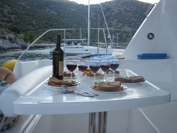 Half the allure of cruising is relaxing in the cockpit with friends in a gorgeous location, in this case, in Turkey.