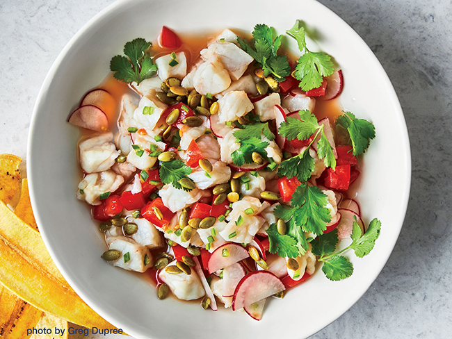 Here is a classic ceviche recipe from foodandwine.com, you can always add your own favorite toppings and add-ins but this is a great beginning. Whenever making a raw seafood dish make sure you use the freshest fish available. Cover the fish in lime juice and let it soak around 30 minutes. Add in additions of tomato, radishes, orange juice, chile and salt. Read More