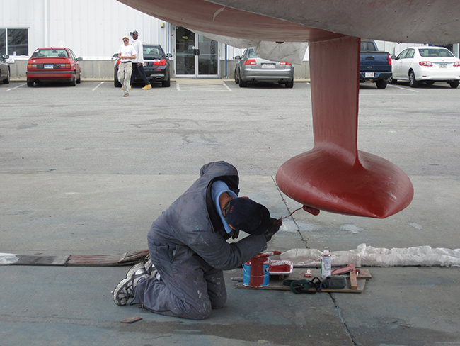 I have worked on and owned boats for almost all of my life and part of that life is the annual ritual of renewing the antifouling paint. It has to be done but it is one commissioning job that I really don’t look forward to. I have sanded the bottoms of boats large and small and years ago we didn’t think about wearing respirators. How much copper dust I’ve inhaled is anyone’s guess and it is amazing that I and my sailing pals haven’t succumbed to copper and tin poisoning. We’re smarter about that now and wear full paper suits, respirators, goggles and gloves when sanding the boat’s bottom. Taping the waterline on a boat with a six-foot draft is a challenge; to get it straight you need a step ladder and two extra pairs of hands. If you haven’t put your cans of bottom paint in a vibrator fairly recently, then stirring thick, gooey copper laden paint by hand is no small task; a paint-stirring drill bit helps but is by no means perfect. Applying the paint with a roller and cutting with a brush along the waterline, around the prop shaft and rudder is straightforward but can be shoulder wrecking on larger boats. Then, to do it right, you need to apply at least two coats. Cleaning up rollers and brushes with solvent is another chemistry experiment with more uncertain health hazards but has to be done. Or, if you choose the new water-based bottom paints, clean up is simpler, which is the trade off for less effective antifouling properties. Finally, the only really good part of the whole job: you peel the tape off the waterline in long ribbons, like opening a present, and then stand back and admire your boat wearing a new, smooth and bright bottom. She’s ready to go and it’s a whole year until you have to do this again.