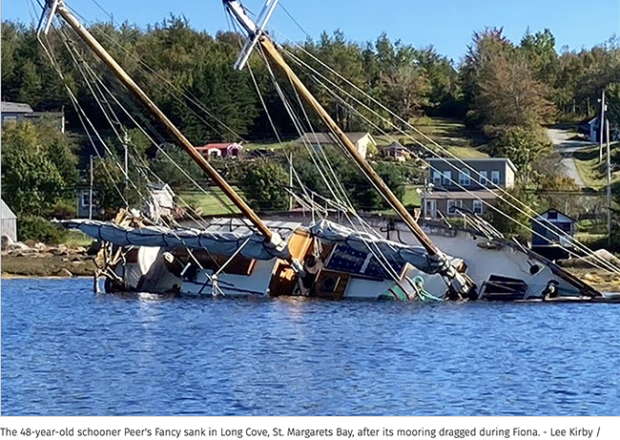 (sailwire.com) – A schooner sunk by post-tropical storm Fiona after the 48-year-old wooden sailboat’s mooring dragged in St. Margarets Bay, Nova Scotia was floated again this week by a crew of mariners eager to help.
