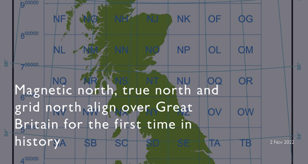 From the blog on the ordnancesurvey.co.uk comes the news that for the first time in history magnetic north, true north and grid north are all coming into alignment over Great Britain. Read more and watch video to learn about the changing direction of magnetic north