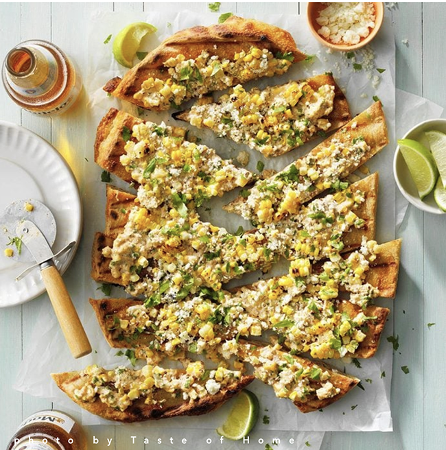 (tasteofhome.com) – This is a fun twist on elote, the classic Mexican corn dish. Typically elote is a grilled corn cob garnished with lime, cheese and cilantro and brushed with mayonnaise. Here the grilled corn is cut from the cob. Mayonnaise, cheese, cilantro, lime juice, chili powder and pepper are mixed in with the corn and placed atop a warm flatbread. Read more.