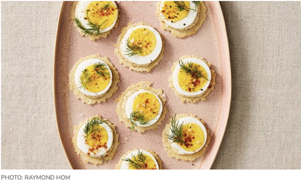 These deviled eggs from marthastewart.com are a great appetizer as the eggs are bite-sized on top of a cracker making them easy to eat. The recipe calls for rice crackers though you can certainly choose your own. Slice the hard boiled eggs, mixing with mayonnaise, Dijon mustard and some paprika, and pepper. Garnish with a sprig of dill. Read more.