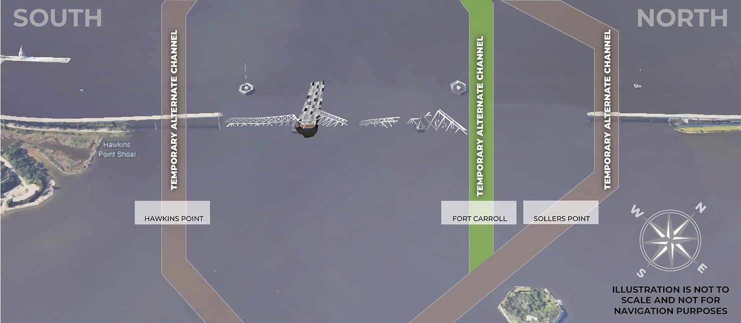 This week, the Captain of the Port of Baltimore and the U.S. Coast Guard announced that a third, deeper channel was now open for boats and smaller ships to move through the downed bridge to the commercial port. It is called the Fort Carroll Channel.