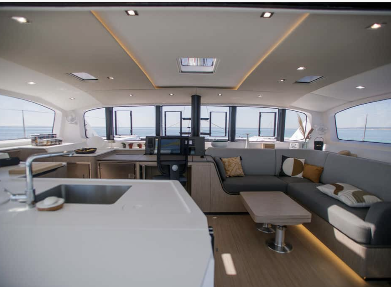 So, when Outremer set out to design a model that could replace the 51, they took a lot of what they had learned in the 55 and applied it to the new smaller cat. The result is a kind of hybrid of the 55 and the 51, yet it is a completely new boat.