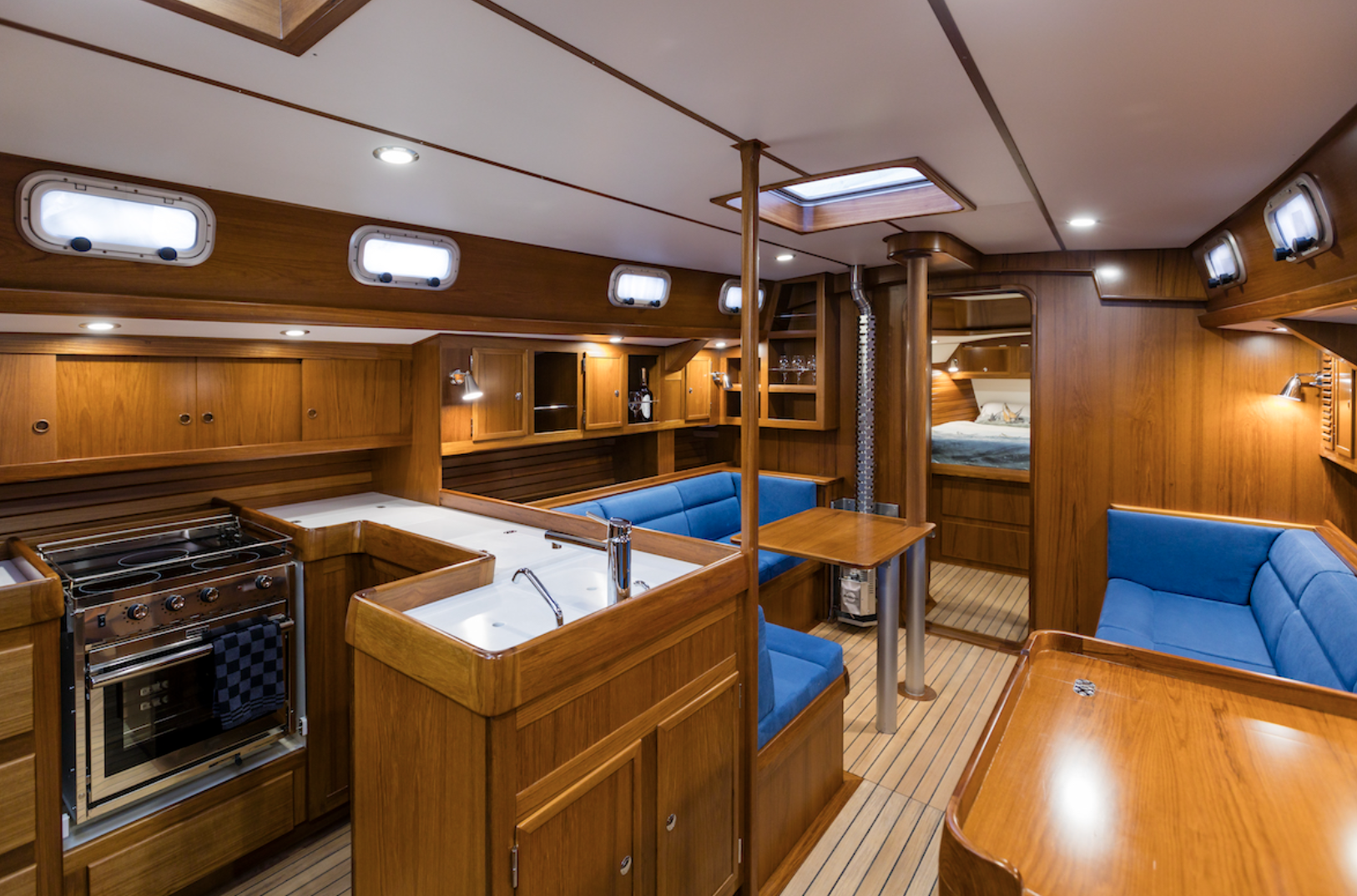 The fit and finish of the Hutting 46, like all of their boats, is highly-evolved, traditional yacht style with solid wood bulkheads, cabinets, drawers and doors all finished in subtle matte varnish. The interior is warm and comfortable and what you would expect from a builder of traditional, wholesome cruising yachts.