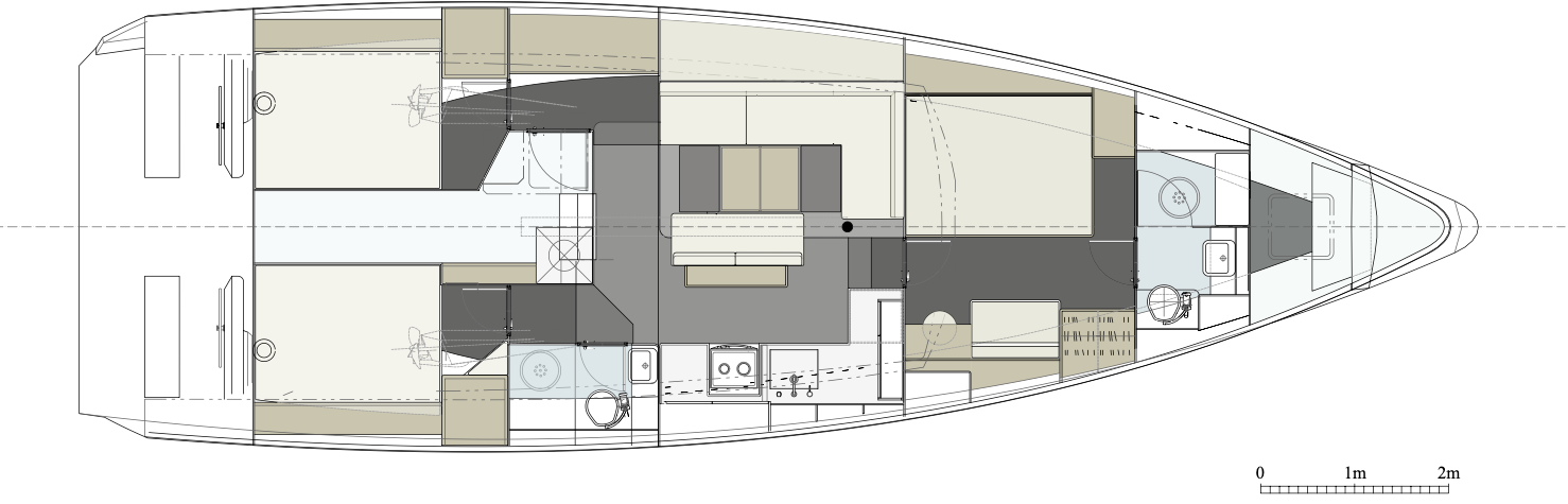 The initial accommodation plans call for a three-cabin layout with the master suite forward and the quarter cabins, each with a large double berth, aft.