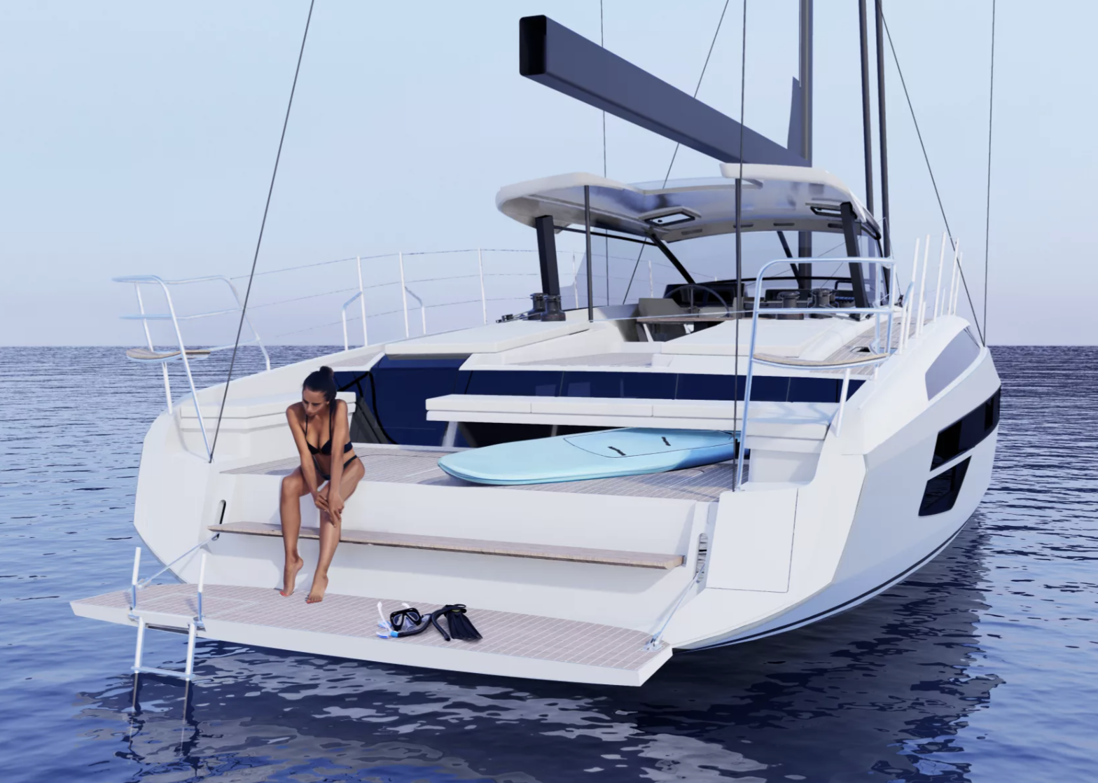 The flat bottom may pound in a head sea but is a very fast shape and one that is appearing on more and more European-designed cruising boats. Under the water, they offer either a fixed keel or an articulated folding keel that extends the depth to almost 13 feet.