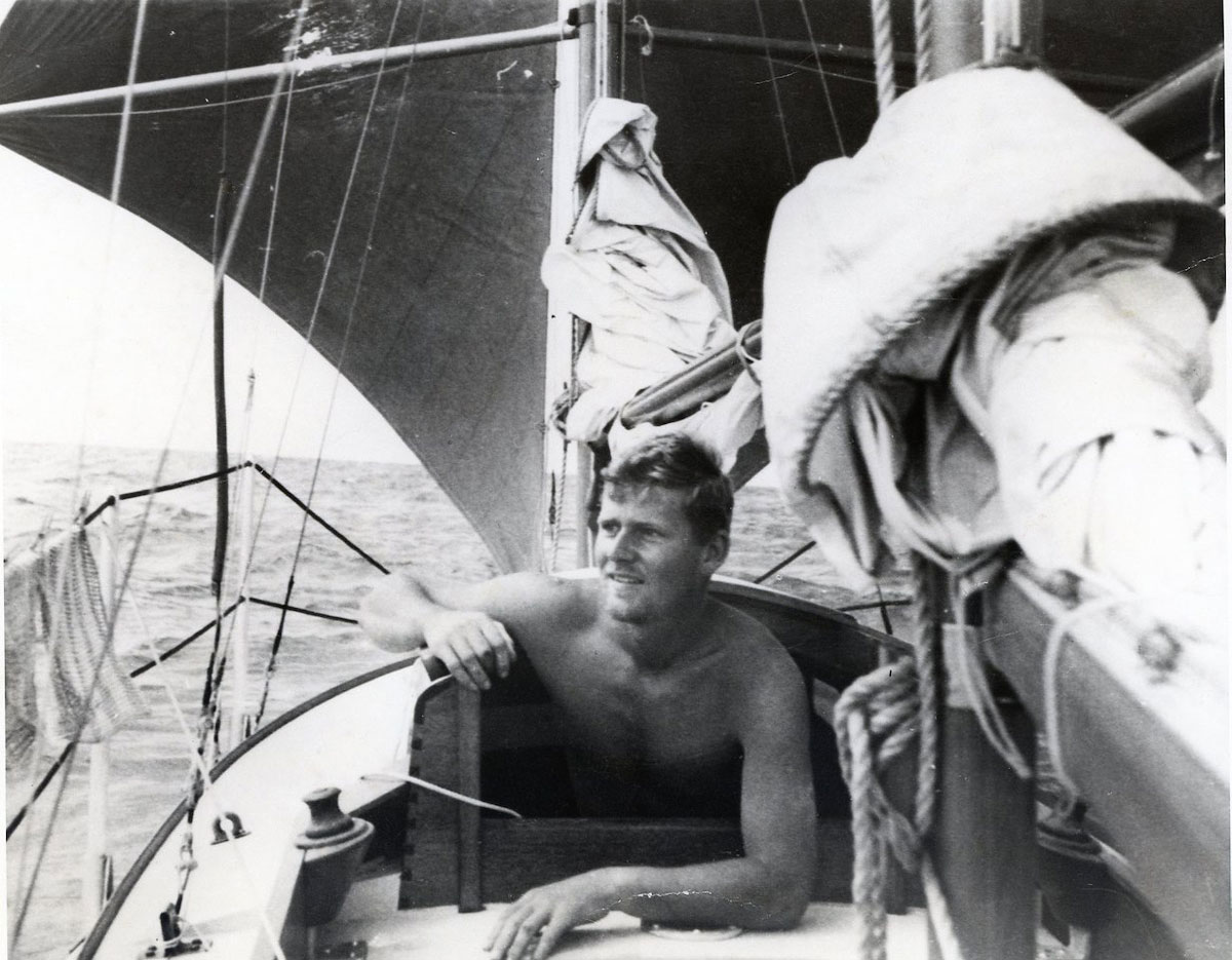 In 1955, when John was 25, he set off from British Columbia aboard a 21-foot yawl designed by Laurent Giles that he had built himself. The boat was way ahead of its time, with a light, shallow hull, reverse sheer and an early cruising fin keel and semi-spade rudder.