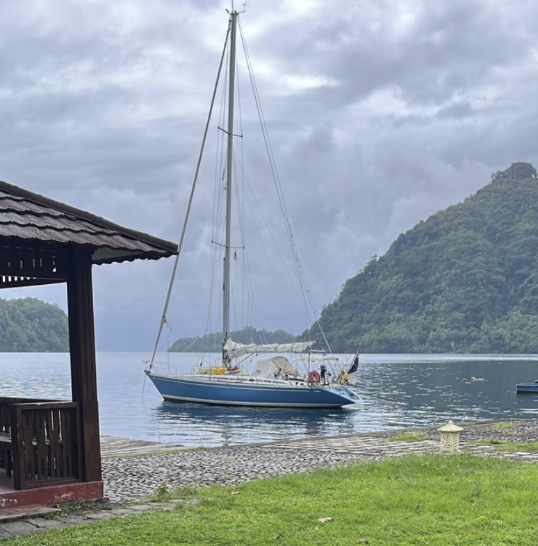 About 1400, local time, yesterday we lost the rudder. There was no warning, but it all went. I ascertained this by swimming under the boat. There was no ingress of water – just no way we could steer. We attempted a spinnaker boom with floorboards & using blocks & tackles to no avail. This morning we streamed the drogue – which helped for a bit – but then the stitching all fell apart and we lost it. Wind has been blowing 25kn – so not excessive, but very uncomfortable cross seas. We did not believe we could sail to any point on land and so made the decision for a Mayday. The Chinese bulk carrier SMAC Transponder stayed with us yesterday and picked us up this morning. We have scuttled Water Music. We all got off without any personal loss or injury.