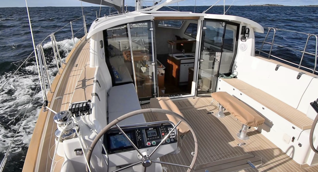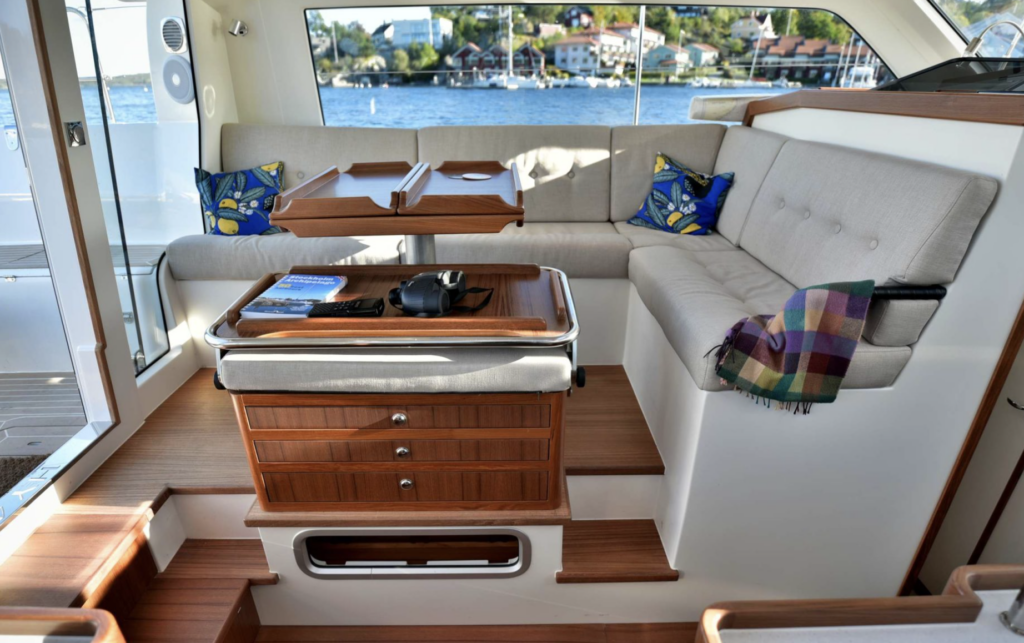 The first thing you note on climbing aboard is the huge cockpit, with a wide folding platform aft. This is as spacious and outdoor living area as you will find on a boat under 50 feet. Even better, the cockpit space flows into the saloon through large full height glass doors.