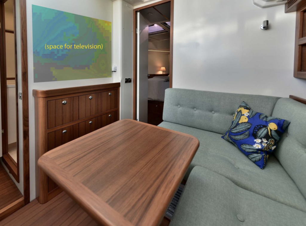 Down another step going forward is the main lounging area with an L-shaped sofa and coffee table. There is a good place to mount a TV across from it above another set of teak faced lockers. There are two cabins with double berths and a head between them. The master cabin has a large walk-around double while the guest cabin has a low, built-in double.