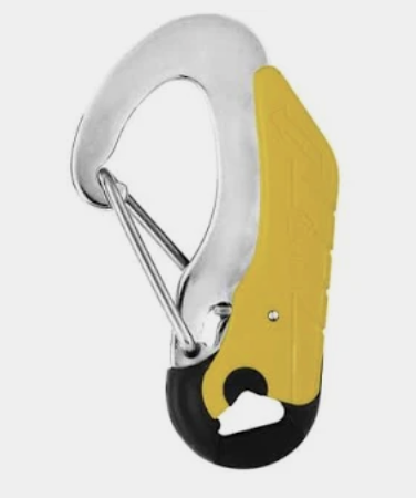 The hook at the end should be a double-action hook, one that you can open with one hand but which will not self-open if twisted on the attachment point. There are three brands of hooks that are generally favored by experienced sailors made by Wichard, Gibb and Kong. I’ve always had a Wichard double action hook on my tether. But, I’ve heard that both the Gibb and the Kong hooks are easier to open.