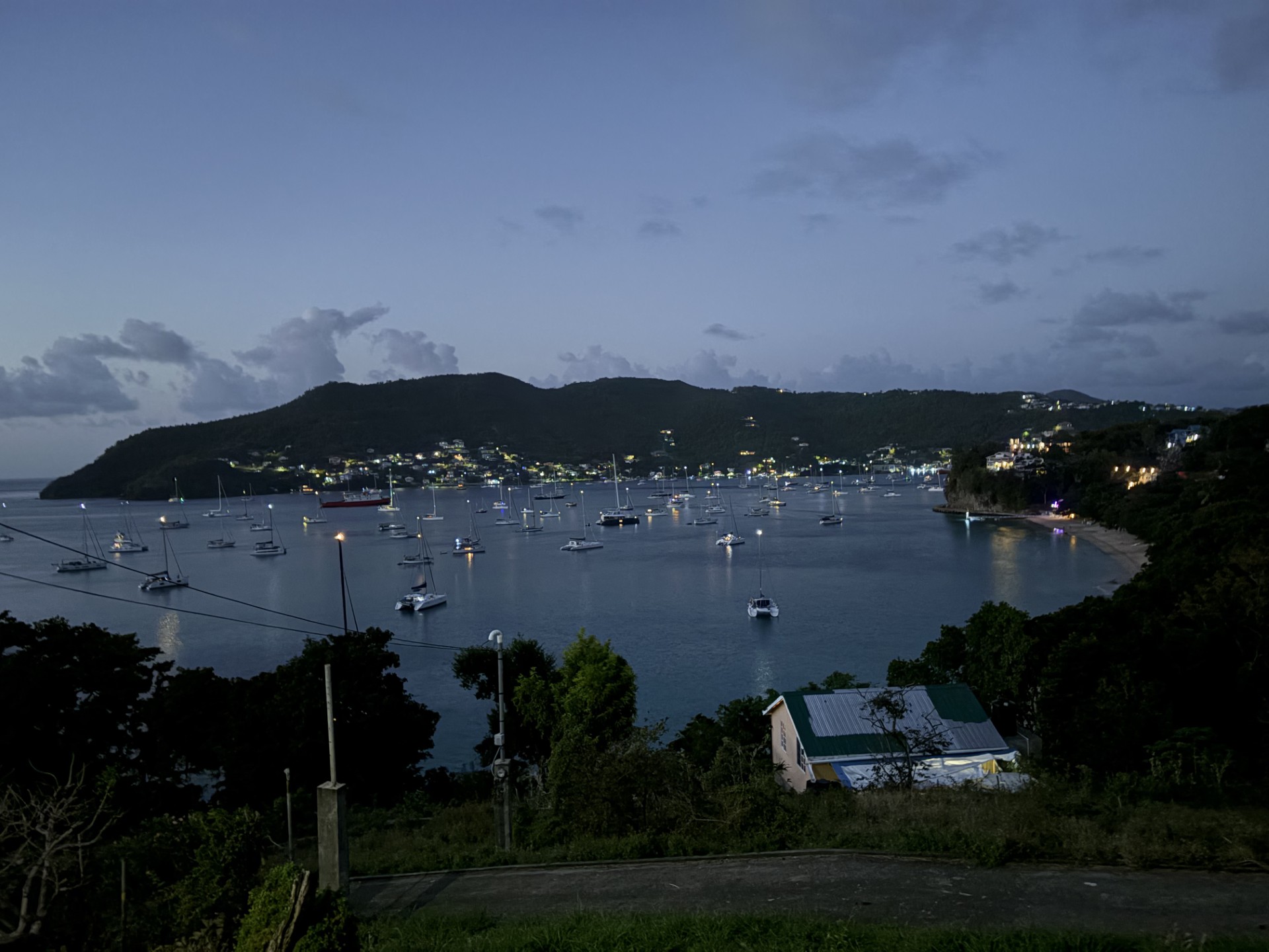 Here’s a shot I took at twilight looking down on the well-protected Admiralty Bay, Bequia, the Grenadines
