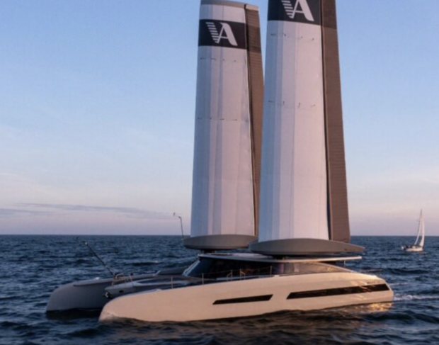 While the concept of side by side instead of fore and aft rigs on articulated booms has been around for a while and used by American designer Chris White on some of his cruising cats, but the addition of inflatable wing sails takes this innovative idea to a new almost revolutionary level.