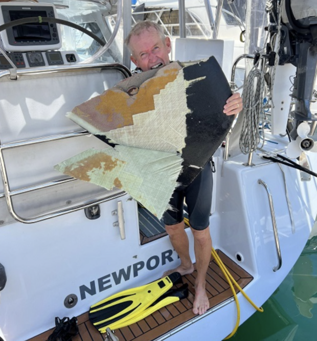 “It wasn’t until we tied up in the marina and took a look under the boat that we realized the extent of the damage. The next morning I purchased an aggressive hand saw, put on a wetsuit, hooked up my hookah air compressor and spent an hour under the boat sawing through the remainder of the broken rudder.”