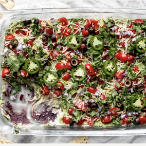 On October 13, 2022 / By Sandy ParksHere is a healthy version of the 7-layer dip. From ambitiouskitchen.com this recipe includes refried beans, yogurt, avacados, jalapeño, shredded cheese, grape tomatoes, olives and onions. You won’t ...