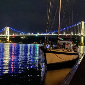 Bob and Linda Boynton caught this image of their Hallberg-Rassy 46 moored in the Hudson River, NYC, after transiting the Erie Canal ...