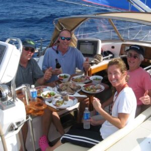 On February 24, 2022 / By Sandy ParksGeorge Day took this shot of the crew of Thumbs Up dining on freshly caugh Mahi Mahi half way between the US East Coast and the BVI. From left, ...