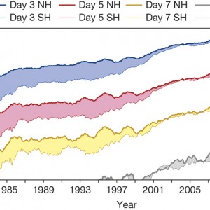 This figure from a recent Nature article is a nice representation of the advances in weather prediction over the past 35 years. Values greater than 60% indicate useful forecasts, while ...